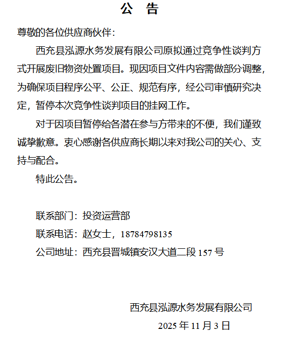 西充縣泓源水務(wù)發(fā)展有限公司廢舊物資處置項目終止公告